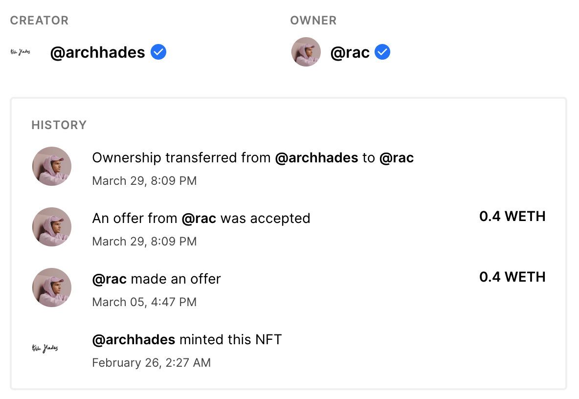 재미있는건 시들 중 하나가 사건의 주인공인 RAC 에게 팔린 점이다. 위에 그림 중 오른쪽 그림이 팔린 시다. 세 줄 짜리인 저 시의 가격은 0.4 WETH, 한화로 약 150 ~ 250 만원 정도의 가격이다. 솔직히 얼탱이 없다. WETH 는 이더리움의 옛날 코인이다. 그 가치는 이더리움과 엇비슷하다. 판매 내역은 아래처럼 나온다. 신기하다. 4월 5일 즈음에 RAC가 구매 제안을 했고, 29일에 거래가 성사되었다. 4월 5일이라면, 사건이 일어나기 바로 직전이다.