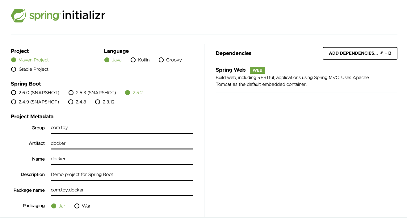 작고 귀여운 스프링 부트 토이 프로젝트를 생성한다. dependency는 spring web만으로 충분하다. 생성한 프로젝트에 두 가지 작업을 더한다.
