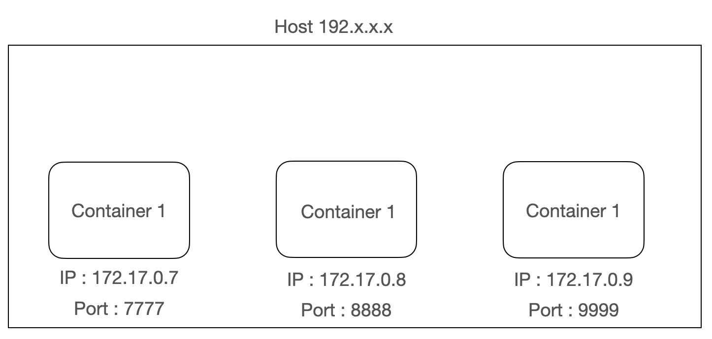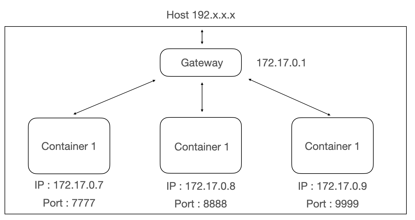 암튼 이런 Gateway의 존재로 컨테이너간 통신을 아주아주 원활하게 관리할 수 있다. Gateway를 고려한 컨테이너 간 통신 체계는 다음과 같다. 컨테이너는 서로 직접 연결하는 것이 아니라 이처럼 Gateway 를 통해서 통신한다. 또한 host와 컨테이너간의 통신도 Gateway를 거친다. 컨테이너들이 서로 다른 주소를 사용하고 있음에도 port가 겹치면 안되는 이유가 여기에 있다. 또한 외부에서 컨테이너에 접근할 때 컨테이너의 주소가 아닌 host의 주소를 사용하는 이유도 여기에 있다. 외부에서 컨테이너에 직접 접근은 불가능하다.