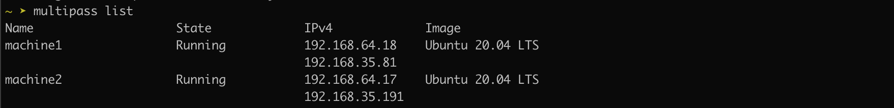 우선 multipass를 이용해 두 개의 가상 머신을 띄운다. os는 Ubuntu 22.04.