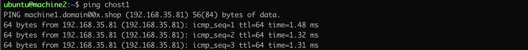 추가로 /etc/resolv.conf 에서 search 로 명시된 부분은 앞서 /etc/systemd/resolved.conf 에서 Domains에 적은 것인데 도메인 없이 host로만 통신을 할 수 있게 해준다. 말하자면 아래처럼 chost1 식으로 도메인 정보 없이 호스트 정보만 가진 트래픽이 있을 때 chost1 에 .domain00x.shop 을 붙여주는 역할이라고 보면 되겠다.
