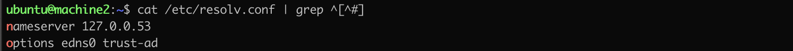 다음은 머신의 Name Server 설정을 바꿔보는 실습이다. 우분투 머신의 Name Server 정보는 /etc/resolv.conf 파일에서 확인할 수 있다. 127.0.0.53 은 엄밀히 말해 Name Server 의 주소는 아니고 도메인 질의를 Name Server로 넘겨주는 로컬 프로세스 (systemd-resolved 가 구동) 의 정보다.