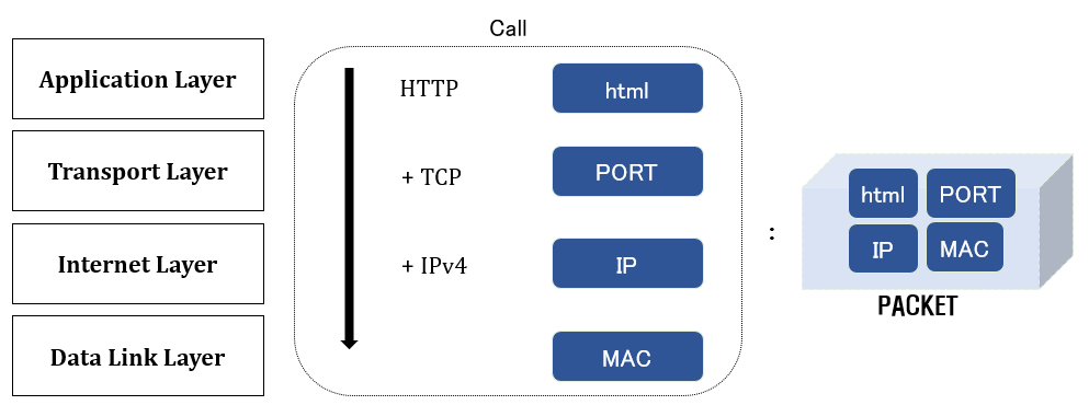 각각의 프로토콜에 의해 패킷에 특정한 정보들이 추가된다. HTTP는 html 데이터, TCP는 전송지와 출발지 Port, IPv4는 전송지와 출발지 IP를 각각 담고 Data link layer에서 객체의 MAC 주소가 담겨져 패킷이 구성된다. 이렇게 구성된 패킷은 패킷에 명시된 도착지의 정보에 따라 다른 객체에게 전달된다. 이런 식의 데이터 전송 체계를 프로토콜이라고 통칭할 수도 있겠다.