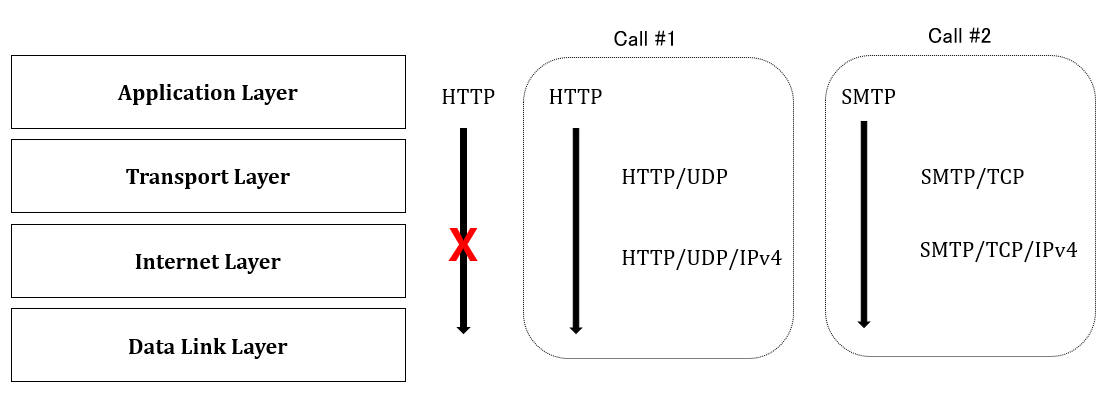 HTTP와 SMTP의 차이는 HTTP와 TCP의 차이와는 다른 결을 지닌다. 이는 앞서 언급했던, 프로토콜 호출의 성질과 관련이 있다. 호출이 시작된 부분을 기준으로 해당 호출은 그 아래의 모든 계층을 지나야한다. 즉, HTTP 기반의 호출은 그 아래 계층들인 Transport Layer, Internet Layer, Data Link Layer를 거쳐야 한다.