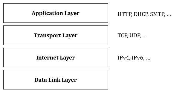 프로토콜의 계층을 딱 하나의 디자인으로 확정할 수는 없는 듯하다. 말했듯이, 프로토콜이란 보충적인 규약이므로 여러 형태로 구체화될 수 있겠다. 통상적으로는 아래의 4계층을 프로토콜의 기본 디자인으로 생각한다.
